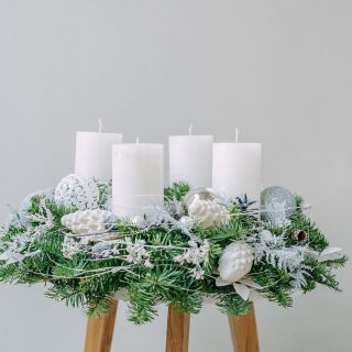 Jemná růžovo-bílá kráska ze vznešených lilií s bílou alstromérií, doplněná o modrý bodlák a červený eukalyptus. Nádech zimy jí přidává bílá a stříbrná statice.